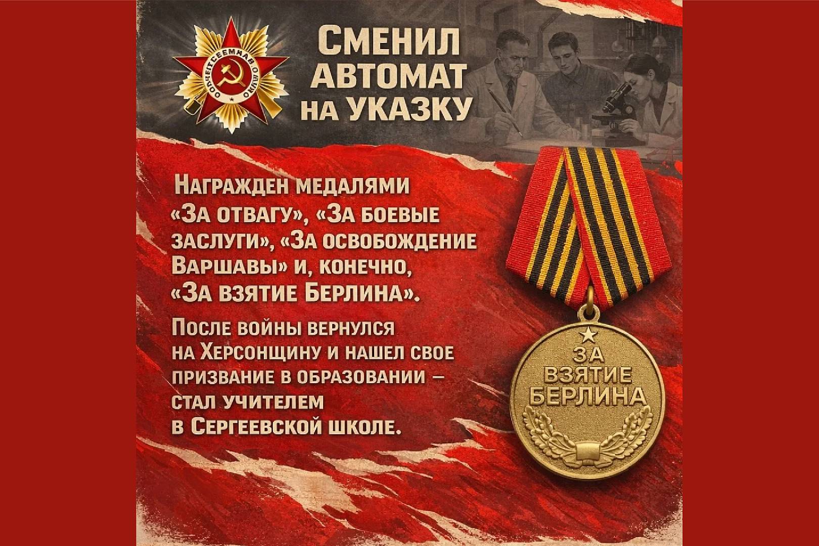 Оба они прошли сквозь ад войны, оба брали Берлин, и оба после возвращения домой посвятили свою жизнь созиданию на родной херсонской земле: один стал бухгалтером, другой — сельским учителем.