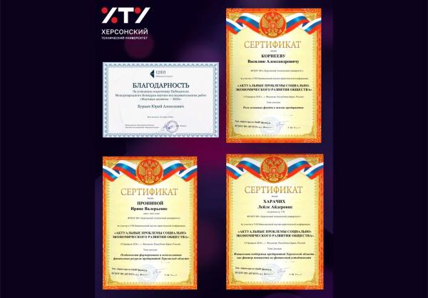 Кроме того, академический коллектив продолжает активный обмен опытом на национальных форумах. Наши коллеги И. В. Пронина, Л. А. Харачих и В. А. Корнеев выступили участниками VIII Национальной научно-практической конференции "Актуальные проблемы социально-экономического развития общества", которая прошла 19 февраля на базе филиала КГМТУ в Феодосии. На днях исследователям были вручены именные сертификаты, подтверждающие их вклад в работу конференции.