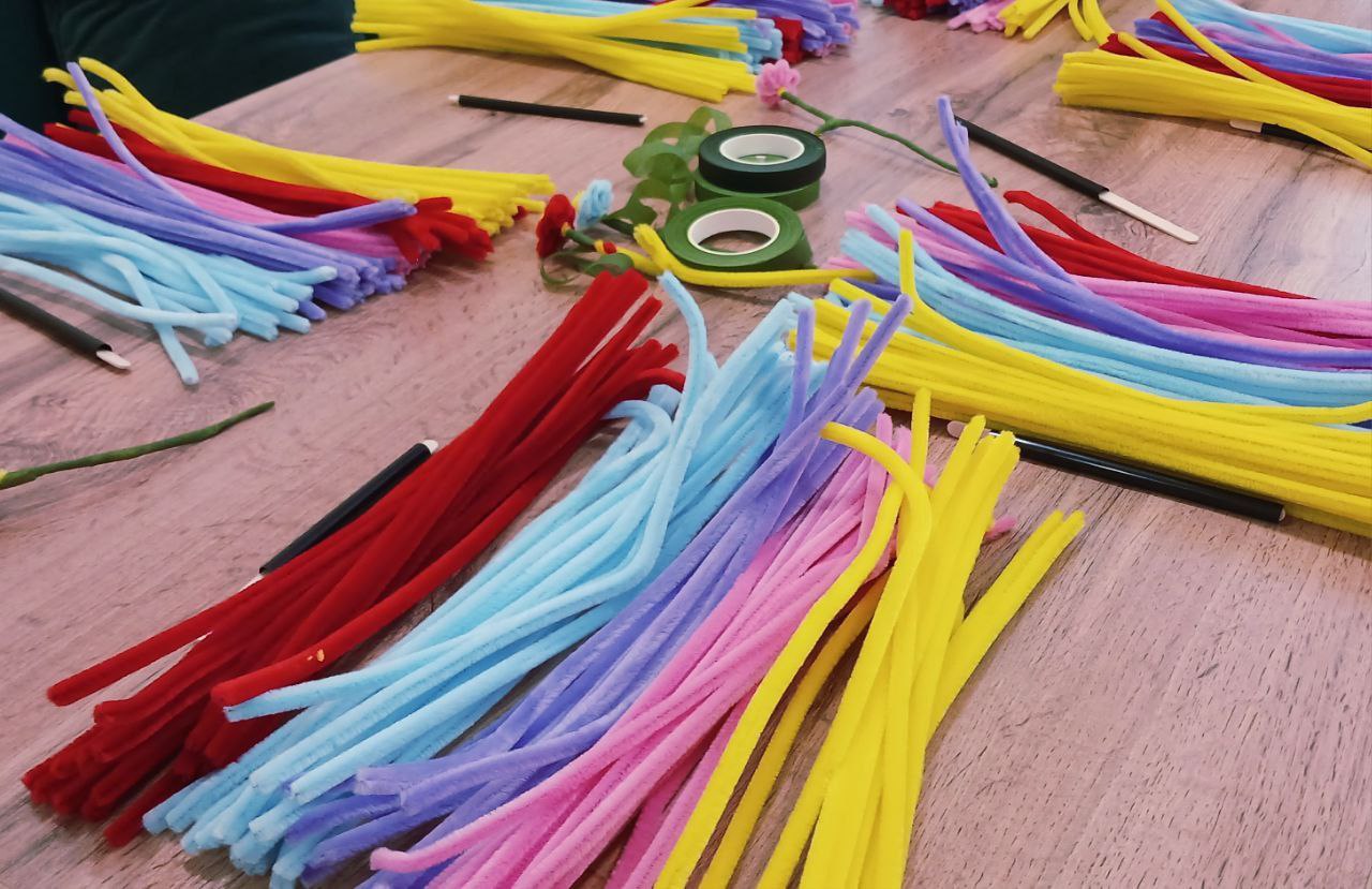 Главным «героем» творческой встречи стала синельная проволока — мягкий и пушистый материал. Под чутким руководством организатора проекта Александры и наших студенток, дети от 5 до 12 лет создавали свои первые букеты.